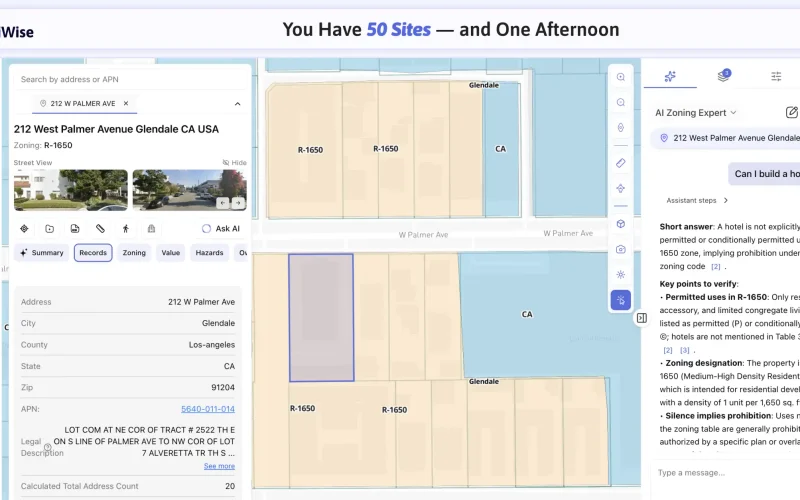 When every parcel means hours across disconnected tools, you only truly review a handful. See how mapping many sites at once-filters, demographics, AI chat, and risk layers in one flow-turns a long list into a shortlist in a single afternoon.